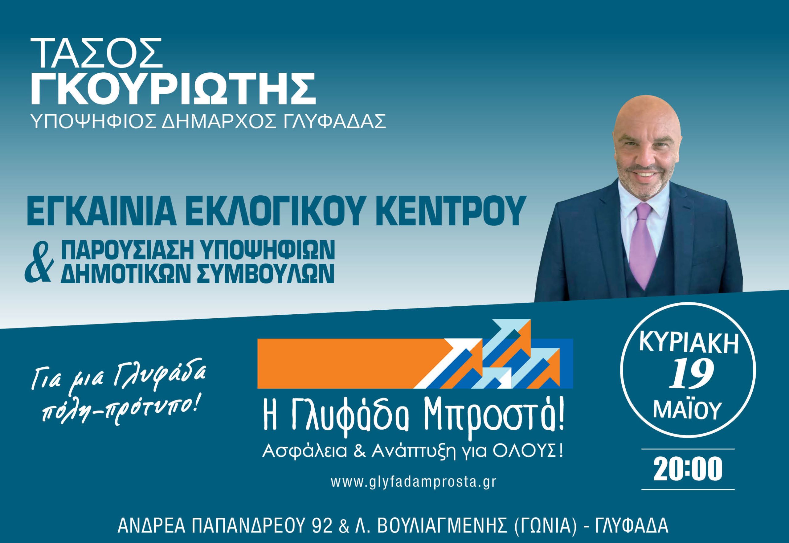 Σήμερα στις 20.00 η ώρα, η παράταξη «Η Γλυφάδα Μπροστά» του υποψήφιου δημάρχου Γλυφάδας Τάσου Γκουριώτη, πραγματοποιεί σε ανοικτή συγκέντρωση την παρουσίαση των υποψήφιων δημοτικών συμβούλων στο εκλογικό κέντρο του συνδυασμού, στην συμβολή των Λεωφόρων Βουλιαγμένης και Ανδρέα Γ.Παπανδρέου στην Άνω Γλυφάδα.