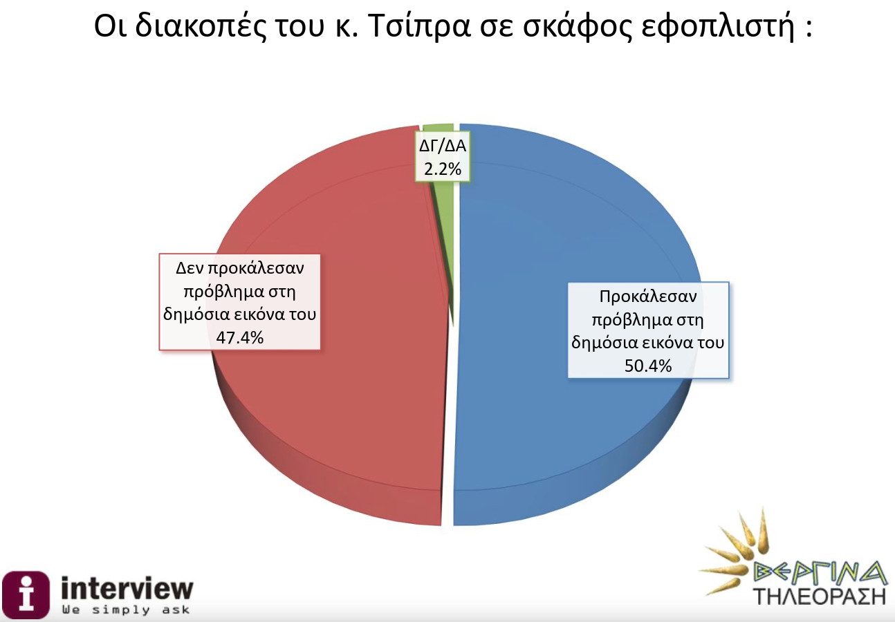 Ετσι το 50,4% των ψηφοφόρων που πήραν μέρος στην έρευνα δηλώνουν ότι «οι διακοπές του κ. Τσίπρα σε σκάφος εφοπλιστή προκάλεσαν πρόβλημα στην δημόσια εικόνα του», ενώ αντίθετη άποψη έχει ένα ποσοστό 47,4%. Στην δημοσκόπηση της Marc που επίσης είδε χθές το φώς της δημοσιότητας ανάλογη ερώτηση δεν υπήρχε αλλά και εκεί η διαφορά ανάμεσα στην πρώτη ΝΔ και τον δεύτερο ΣΥΡΙΖΑ έχει φθάσει στις 8 μονάδες.