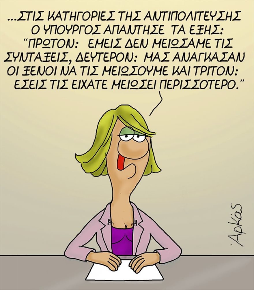 Ένα νέο σκίτσο για την κυβερνητική προπαγάνδα σχετικά με τις περικοπές στις συντάξεις δημοσίευσε πριν από λίγο στο facebook o Αρκάς.
