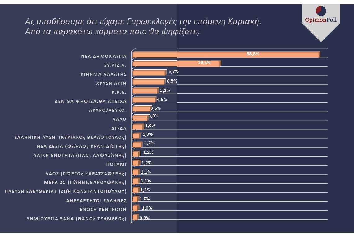 Και στα δύο ερωτήματα για την πρόθεση ψήφου, σε βουλευτικές και ευρωεκλογές, οι ψηφοφόροι δίνουν άνετο προβάδισμα στη ΝΔ με 30% και 38% αντίστοιχα, ενώ ο ΣΥΡΙΖΑ εμφανίζεται αποδυναμωμένος με 17% και 18%.