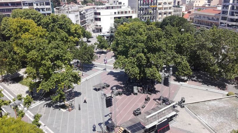 Σχεδόν στο μέσο της κεντρικής πλατείας της Λάρισας έχει στηθεί από το πρωί η εξέδρα για την ομιλία του πρωθυπουργού Αλέξη Τσίπρα.