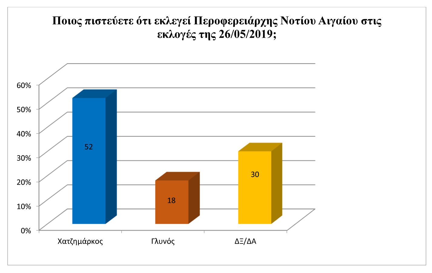 Το αποτελέσμα της δημοσκόπησης για τις περιφερειακές εκλογές Ν. Αιγαίου με δείγμα 850 ψηφοφόρων της περιφέρειας, δίνει σημαντικό προβάδισμα στον Γιώργο Χατζημάρκο, νυν Περιφερειάρχη που στηρίζεται από τη Νέα Δημοκρατία.