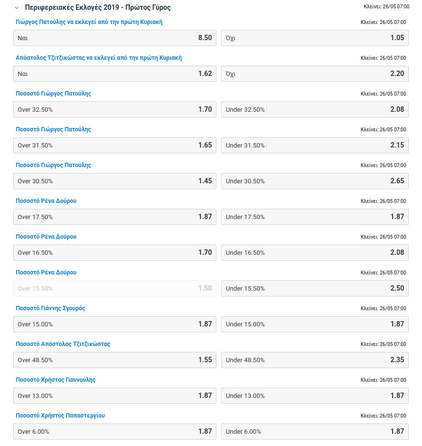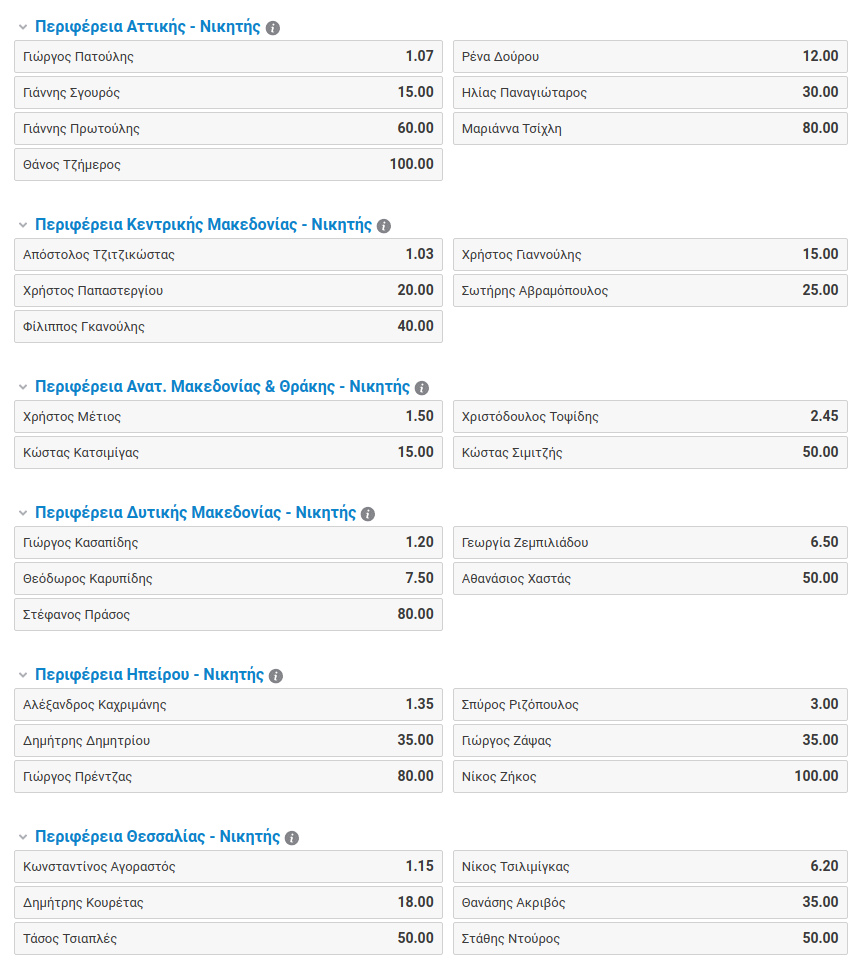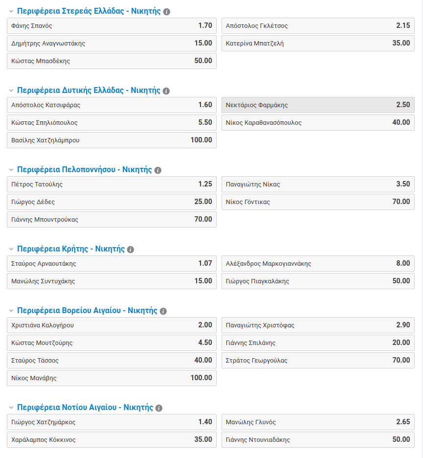 Με μεγάλα φαβορί σε 9 από τις 13 Περιφέρειες της χώρας διεξάγονται την Κυριακή οι Περιφερειακές Εκλογές 2019, όπως προβλέπουν οι στοιχηματικές εταιρείες.