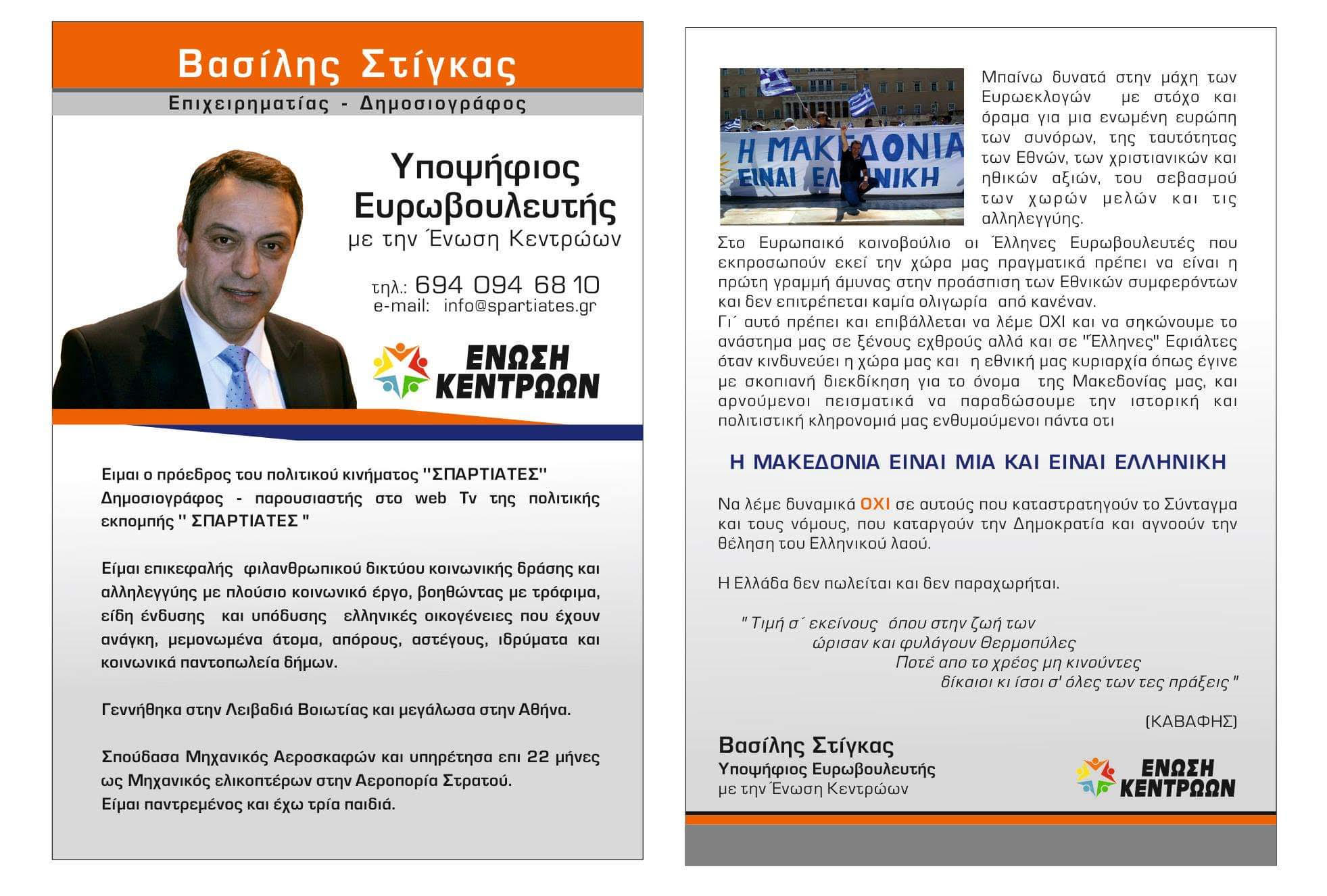Ο Βασίλης Στίγκας με τον πρόεδρο της Ενωσης Κεντρώων Βασίλη Λεβέντη. Η Ενωση Κεντρώων δίνει σκληρό αγώνα για να κρατήσει τα πανελλαδικά ποσοστά της πάνω από 3% και να πάρει το «εισιτήριο» για την Ευρωβουλή. Οι τελευταίες δημοσκοπήσεις δείχνουν ότι είναι στο όριο να το επιτύχει