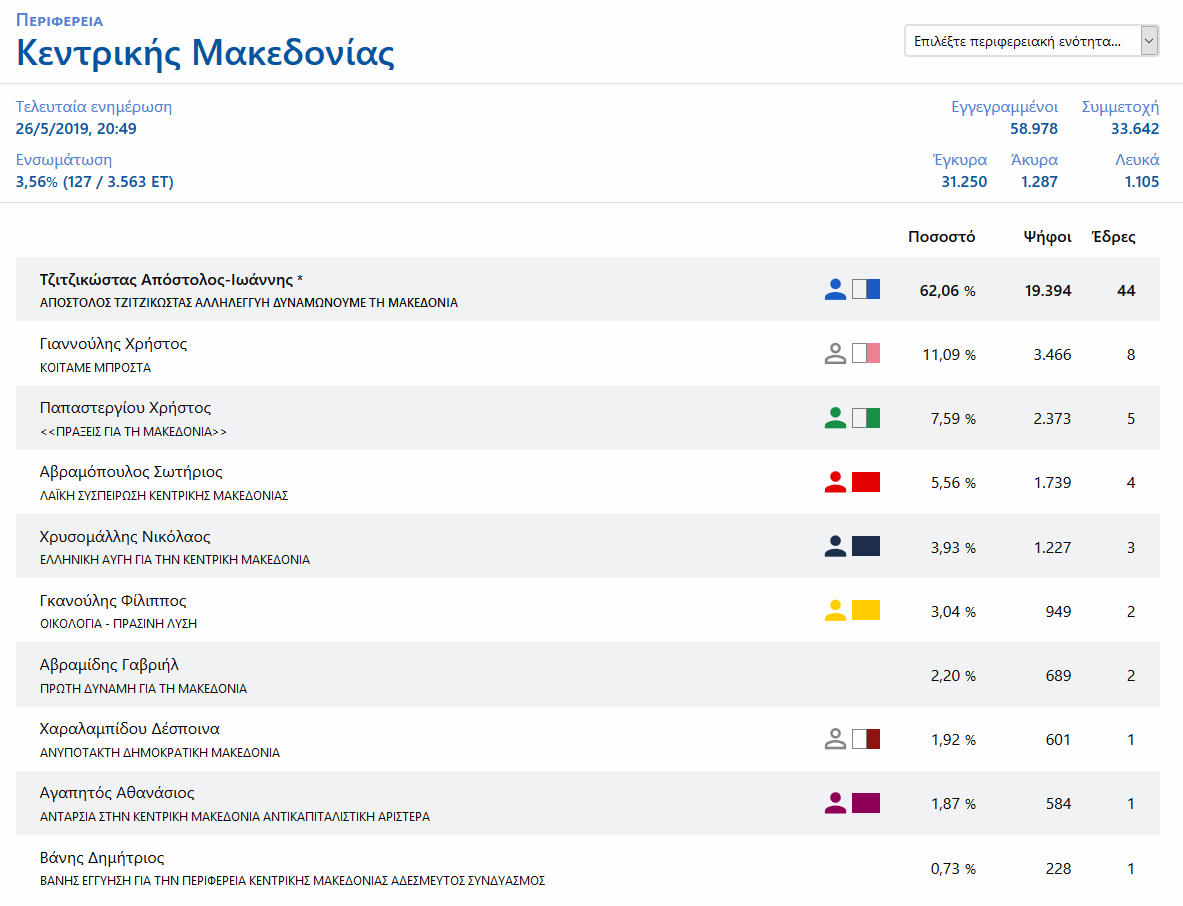 Ειδικότερα στην περιφέρεια Κεντρικής Μακεδονίας και με καταμετρημένο το 5% των ψηφοδελτίων, ο Απόστολος Τζιτζικώστας λαμβάνει το 62,5% έναντι μόλις 11% του υποστηριζόμενου από τον ΣΥΡΙΖΑ Χρήστου Γιαννούλη. O υποψήφιος του ΣΥΡΙΖΑ καταποντίστηκε κυριολεκτικά με 11% στα πρώτα αποτελέσματα.