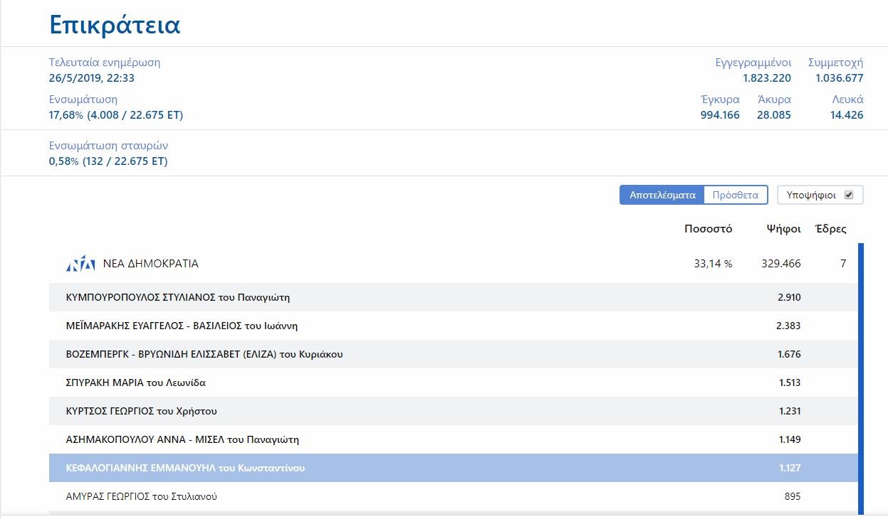 Ο Στέλιος Κυμπουρόπουλος προηγείται στο ευρωψηφοδέλτιο της ΝΔ. Συγκεκριμένα έχει συγκεντρώσει μέχρι τώρα 2.910 ψήφους και ακολουθούν ο Ευάγγελος Μεϊμαράκης με 2.383 και η Ελίζα Βόζεμπεργκ με 1.676.