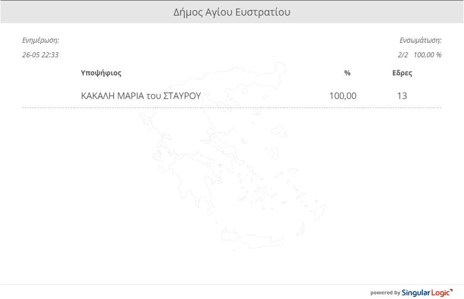 Η Μαρία Κακαλή ήταν η μοναδική υποψήφιος στον δήμο Αγίου Ευστρατίου και όπως ήταν φυσιολογικό, πήρε ομόφωνα την εκλογή.