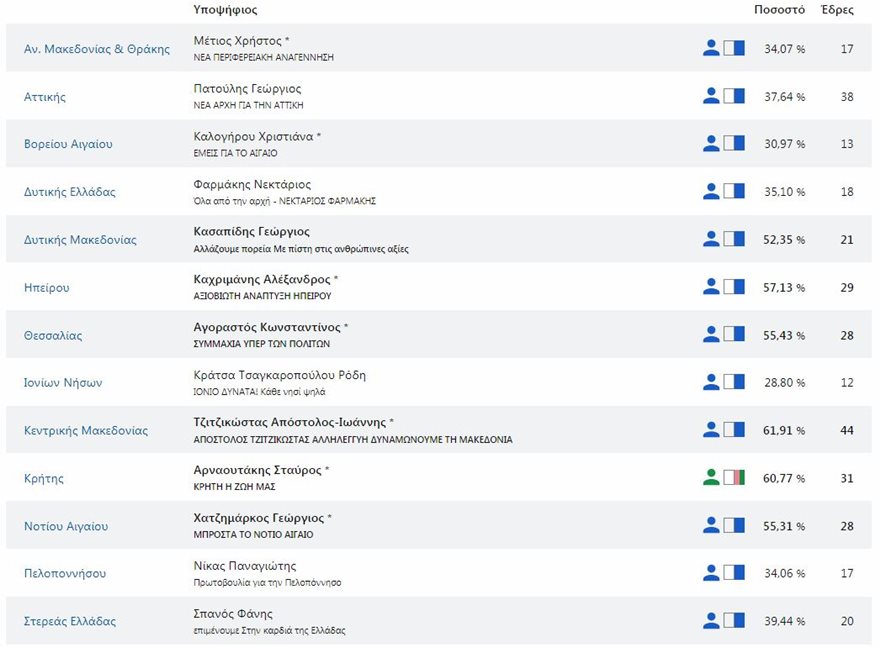 Εκτός από τις Ευρωεκλογές η Νέα Δημοκρατία σάρωσε με τους υποψηφίους της και στις περιφερειακές εκλογές επικρατώντας σε 12 από τις 13 περιφέρειες της χώρας.