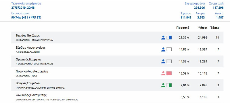Χαρακτηριστικό είναι πως στο 90,74% της ενσωμάτωσης, μόλις 320 ψήφοι χωρίζουν τον Κώστα Ζέρβα και τον Γιώργο Ορφανό. Ο κ. Ζέρβας είναι στη δεύτερη θέση με 16.589 ψήφους, αλλά ο κ. Ορφανός είναι πολύ κοντά, με 16.269 ψήφους. Οσο για την Κατερίνα Νοτοπούλου, είναι εκτός μάχης, καθώς βρίσκεται στην τέταρτη θέση με 15.118 ψήφους. Ολα αυτά, ενώ απομένουν να καταμετρηθούν και να ενσωματωθούν οι ψήφοι σε 44 εκλογικά τμήματα.