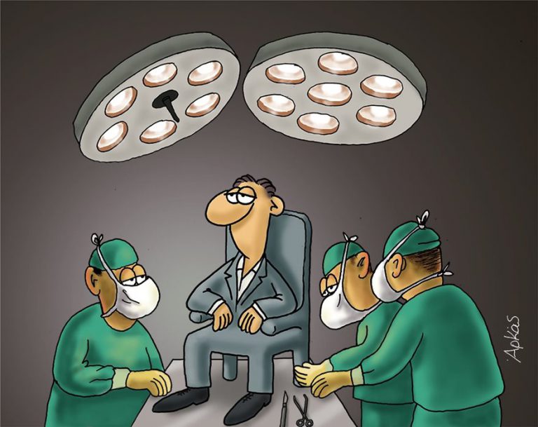 Στην επίσημη σελίδα του στο Facebook, ο σκιτσογράφος στο ένα σκίτσο τοποθετεί πάνω στο χειρουργικό τραπέζι τον αγκιστρωμένο πολιτικό, με τους χειρουργούς να προσπαθούν να τον αποκολλήσουν με επέμβαση ανοιχτής… καρέκλας.