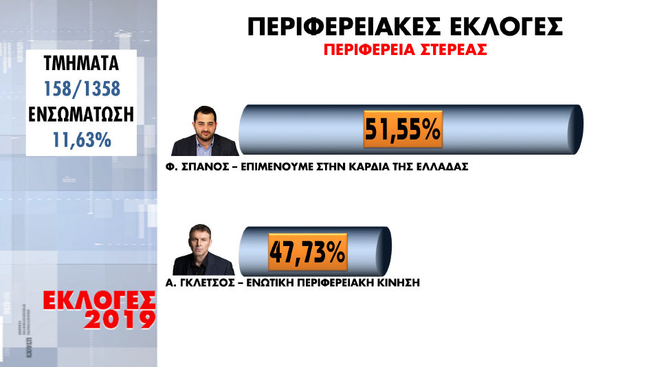 Με τη ενσωμάτωση στο 11,63%, τα αποτελέσματα δείχνουν προβάδισμα του Φ. Σπανού στην Περιφέρεια Στερέας Ελλάδας.
