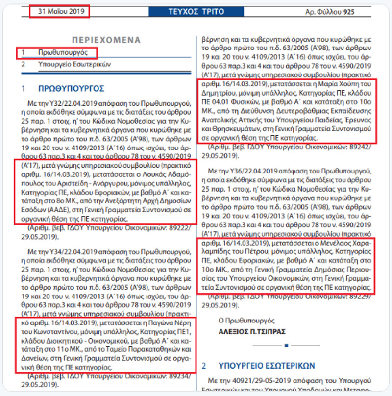 Όπως προκύπτει από την Εφημερίδα της Κυβερνήσεως, στις 31 Μαΐου, κι ενω η χώρα βάδιζε ήδη σε πρόωρες εκλογές μετά την συντριπτική ήττα του κυβερνώντος κόμματος στις ευρωεκλογές, με απόφαση του Αλέξη Τσίπρα, μετατάχθηκαν στην Γενική Γραμματεία του Πρωθυπουργού 4 μόνιμοι δημόσιοι υπάλληλοι, που οι πληροφορίες θέλουν όλοι να είναι στελέχη του ΣΥΡΙΖΑ. Οι μετατάξεις έγιναν λίγα 24ωρα πριν ξεσπάσει το σκάνδαλο με την Τασία Χριστοδουλοπούλου.