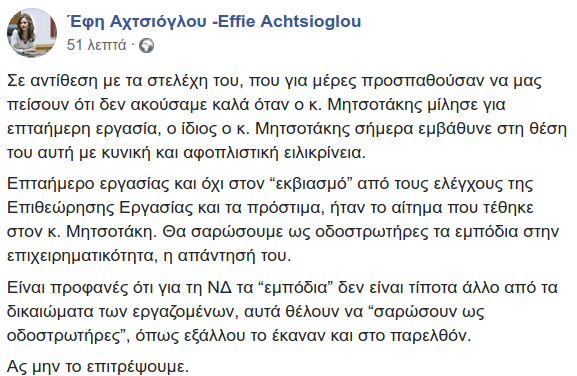 Σε ανάρτησή της στην προσωπική της σελίδα στο Facebook η Εφη Αχτσιόγλου αναφέρεται στα δικαιώματα των εργαζομένων, τα οποία σύμφωνα με την ίδια ο Κυριάκος Μητσοτάκης θέλει να σαρώσει ως οδοστρωτήρας.