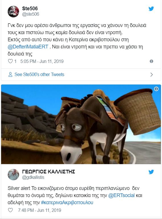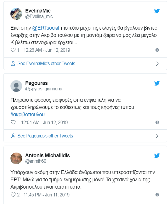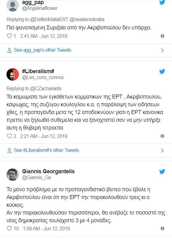 «Ντροπή», «αισχρή προπαγάνδα», «πιο φανατισμένη ΣΥΡΙΖΑΙΑ δεν υπάρχει», «θα έπρεπε να είχε παραιτηθεί» είναι μερικά από τα σχόλια των χρηστών του Twitter για την Κατερίνα Ακριβοπούλου ενώ δεν λείπουν και τα ειρωνικά σχόλια που ζητούν από την ΕΡΤ να… διατηρήσει την εκπομπή «Δεύτερη Ματιά» καθώς έτσι ενισχύει τη Νέα Δημοκρατία.