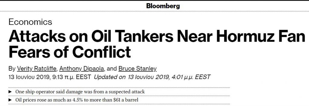 «Επιθέσεις σε πετρελαιοφόρα κοντά στο Ορμούζ: Φόβοι για σύγκρουση» αναφέρει από την πλευρά του το Bloomberg.