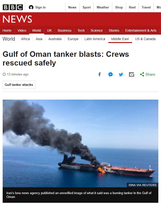«Έκρηξη δεξαμενόπλοιων στον κόλπο του Ομάν: Διεσώθη το πλήρωμα» γράφει το βρετανικό BBC.