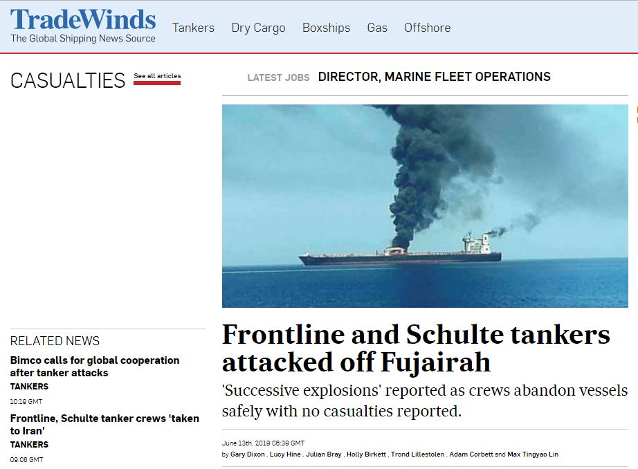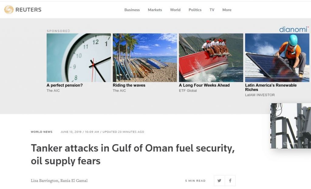 «Επιθέσεις σε δεξαμενόπλοια στον Κόλπο του Ομάν, φόβοι για διαρροή πετρελαίου» γράφει το Reuters.