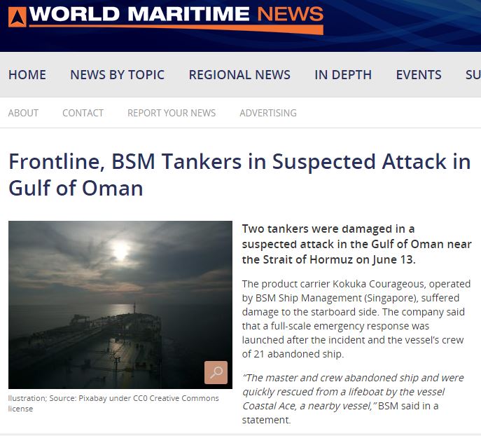 Για «υποψίες επίθεσης στον κόλπο του Ομάν» μιλάει η ιστοσελίδα World Maritime News.