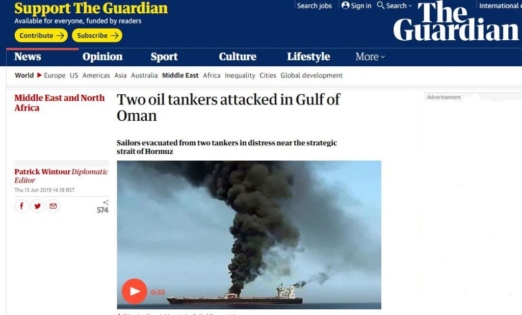 «Επίθεση σε δύο δεξαμενόπλοια στον κόλπο του Ομάν» γράφει ο Guardian.