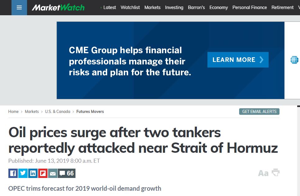 Στην εκτόξευση των τιμών του πετρελαίου στέκεται η ιστοσελίδα Market Watch: «Οι τιμές του πετρελαίου αυξάνονται μετά από επίθεση που δέχτηκαν δύο δεξαμενόπλοια κοντά στο Στενό του Ορμούζ».