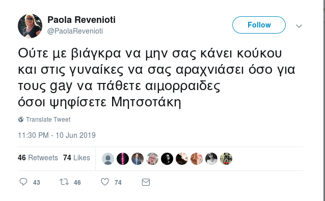 Αίσθηση προκάλεσε το τελευταίο tweet της Πάολα Ρεβενιώτη, από την ΛΟΑΤ κοινότητα, η οποία ως ακτιβίστρια είχε κάνει την εμφάνισή της στα θεωρεία της ελληνικής βουλής το 2017.