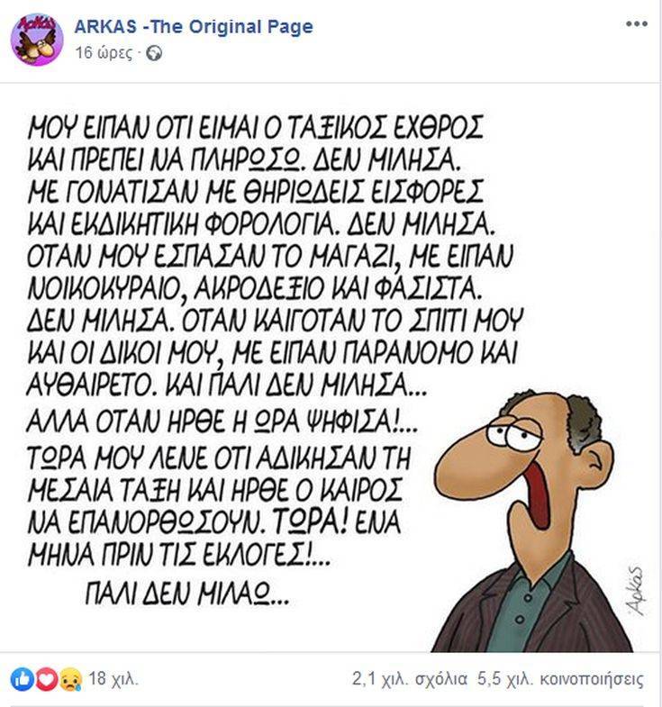 Αλλά όταν ήρθε η ώρα ψήφισα! Τώρα μου λένε ότι αδίκησαν τη μεσαία τάξη και ήρθε ο καιρός να επανορθώσουν. ΤΩΡΑ! Ένα μήνα πριν τις εκλογές. Πάλι δεν μιλάω».
