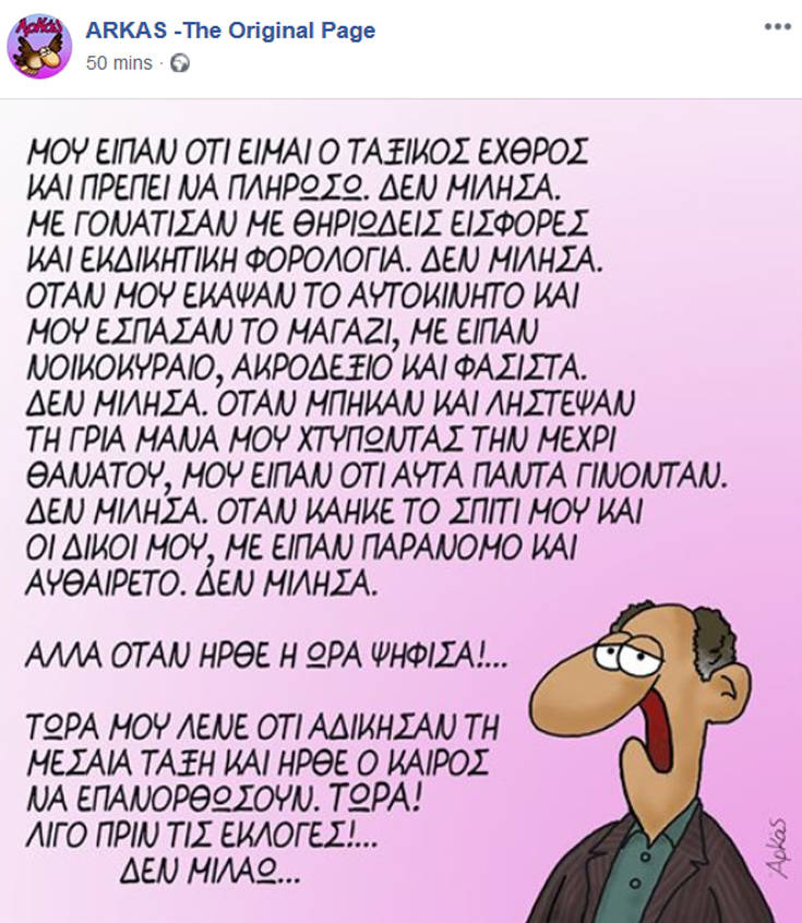 Πριν από περίπου μία εβδομάδα ο γνωστός σκιτσογράφος Αρκάς είχε προκαλέσει πλήθος σχολίων με ένα σκίτσο του το οποίο καυτηρίαζε τις κινήσεις της κυβέρνησης για τη μεσαία τάξη και τις προσπάθειες που κάνει να στραφεί προς τα εκεί πριν τις πρόωρες εθνικές εκλογές.