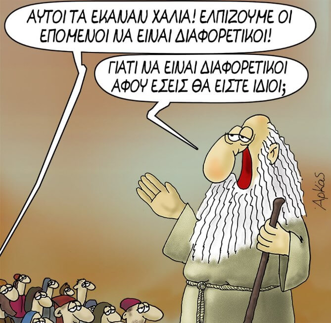 Στο παρακάτω σκίτσο, βλέπουμε έναν άγνωστο πολίτη να προχωρά στην εξής διαπίστωση: «Αυτοί τα έκαναν χάλια. Ελπίζουμε οι επόμενοι να είναι διαφορετικοί». Τότε, ο σοφός με τον χαρακτηριστικό του τρόπο και εμφάνιση απαντά το εξής: «Γιατί να είναι διαφορετικοί, αφού εσείς θα είστε ίδιοι;».