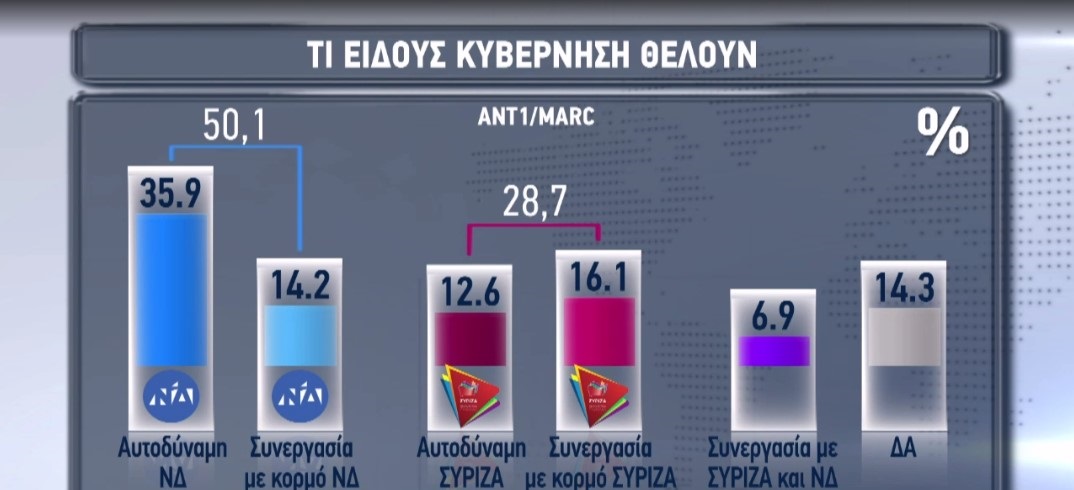 Με 50,1%, οι ερωτηθέντες δηλώνουν ότι θέλουν μια κυβέρνηση ΝΔ, είτε αυτοδύναμη είτε σε συνεργασία με άλλα κόμματα. Το αντίστοιχο ποσοστό για τον ΣΥΡΙΖΑ βρίσκεται στο 28,7%.