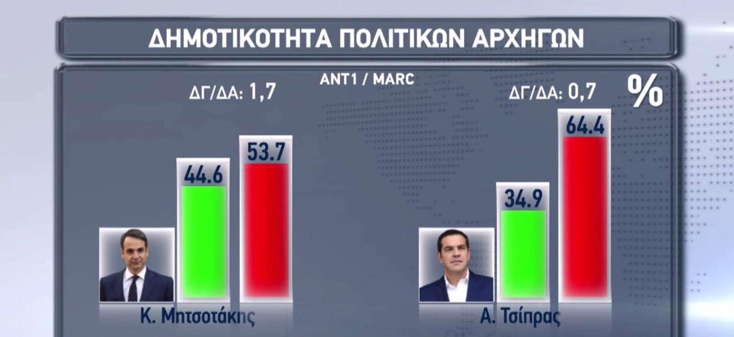 Ο Κυριάκος Μητσοτάκης προηγείται του Αλέξη Τσίπρα με διαφορά 9,7 μονάδων στη δημοτικότητα των πολιτικών αρχηγών, με 44,6%, καθώς ο πρωθυπουργός βρίσκεται στο 34,9%.