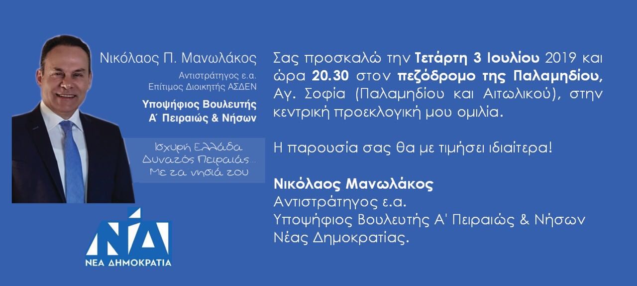 “Σας προσκαλώ την Τετάρτη 3 Ioυλίου 2019 και ώρα 20.30 στον πεζόδρομο της Παλαμηδίου, Αγ. Σοφία (Παλαμηδίου και Αιτωλικού) στην κεντρική προεκλογική μου ομιλία.