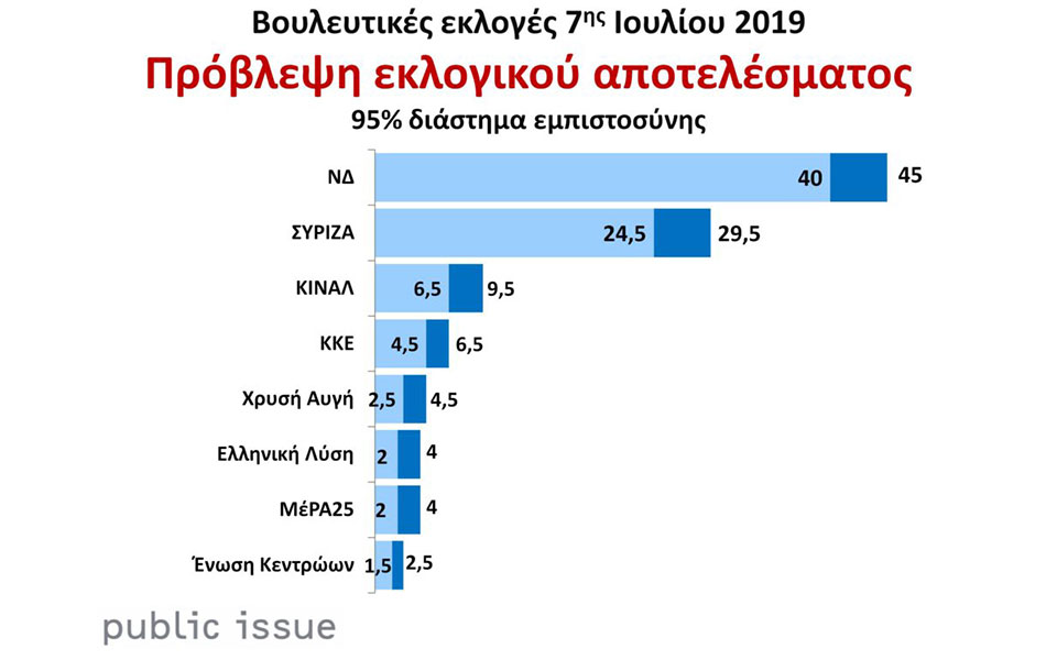 Μεγάλη διαφορά, που υπολογίζεται στις 15,5 μονάδες και υπέρβαση του 40% από τη Νέα Δημοκρατία δείχνει το πολιτικό βαρόμετρο της Public Issue για τον Ιούλιο.