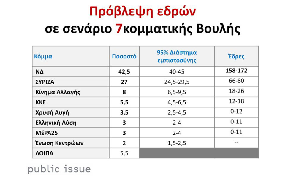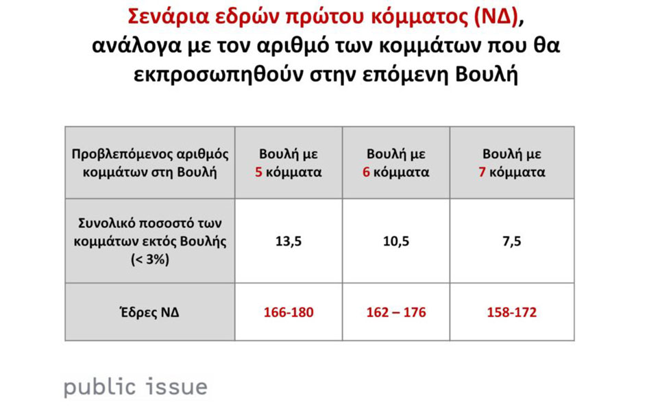 Σύμφωνα με την έρευνα, στις εκλογές της προσεχούς Κυριακής, η εκλογική επιρροή της Νέας Δημοκρατίας αναμένεται να υπερβεί το 40% με αποτέλεσμα να εξασφαλίζει άνετη κοινοβουλευτική αυτοδυναμία σε όλα τα σενάρια (πέντε, έξι και επτά κόμματα στη Βουλή),