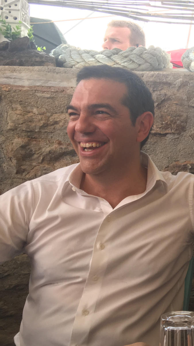Ευδιάθετος και με ένα πλατύ χαμόγελο έφτασε στο Λαύριο ο Αλέξης Τσίπρας για το παραδοσιακό ουζάκι με τους δημοσιογράφους.
