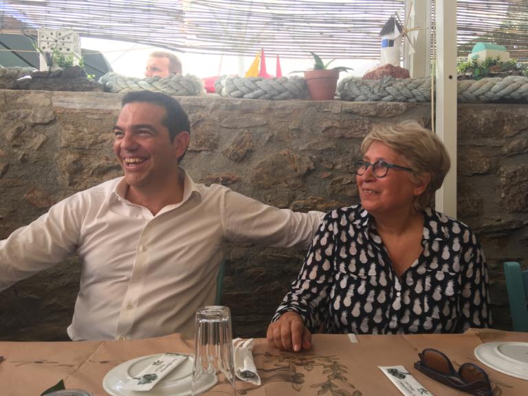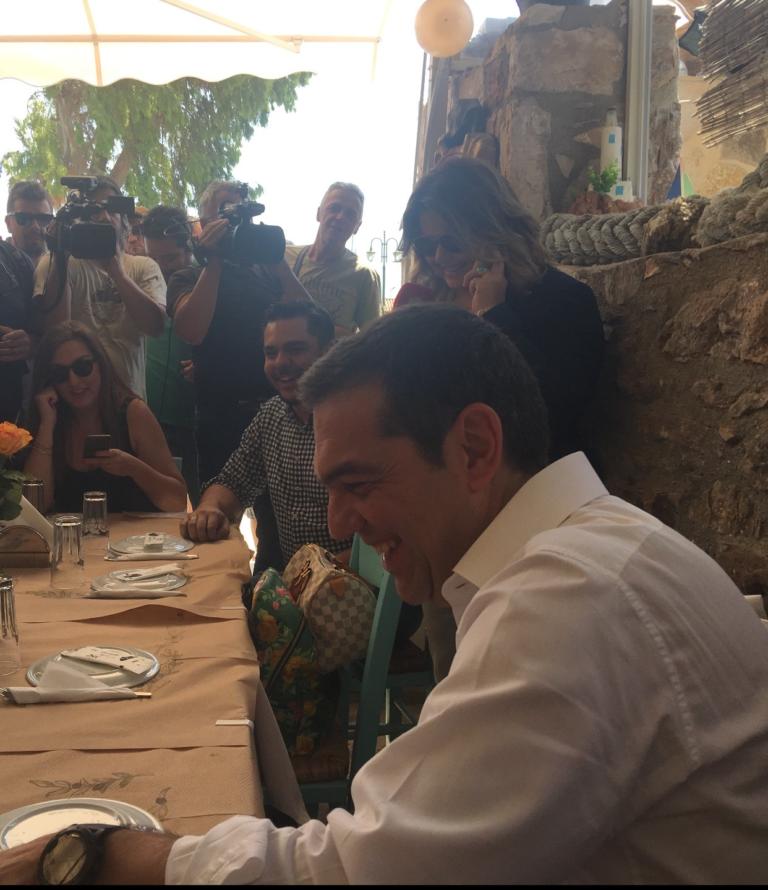Ευδιάθετος και με ένα πλατύ χαμόγελο έφτασε στο Λαύριο ο Αλέξης Τσίπρας για το παραδοσιακό ουζάκι με τους δημοσιογράφους.