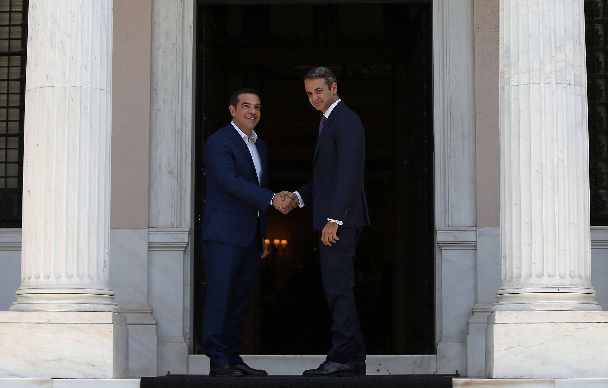 Αμέσως μετά την ορκωμοσία του ο κ. Μητσοτάκης κατευθύνθηκε στο Μέγαρο Μαξίμου, όπου τον περίμενε στην κορυφή της σκάλας ο απελθών πρωθυπουργός, Αλέξης Τσίπρας. Ο κ. Μητσοτάκης ανέβηκε με ταχύ βήμα, αντάλλαξε σύντομη χειραψία για τους φωτογράφους με τον Αλέξη Τσίπρα και στην συνέχεια ο κ. Τσίπρας τον συνόδευσε στο εσωτερικό του Μεγάρου Μαξίμου. Είναι μία διαδικασία που όπως επισήμανε χθες ο κ. Τσίπρας δεν είχε ακολουθηθεί το 2015 όταν έγινε εκείνος πρωθυπουργός αλλά δεν του παρέδωσε το Μαξίμου ο τότε προκάτοχός του.