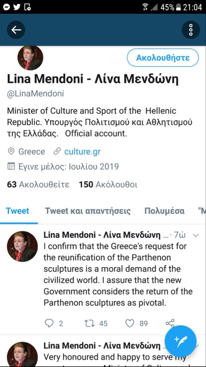 Νωρίτερα, η «ανάρτηση» της κυρίας Μενδώνη από λογαριασμό στο Twitter, στην αγγλική μάλιστα γλώσσα, ανέφερε: «Επιβεβαιώνω ότι το αίτημα της Ελλάδας για την επανένωση των γλυπτών του Παρθενώνα είναι μια ηθική απαίτηση του πολιτισμένου κόσμου. Διαβεβαιώνω ότι η νέα κυβέρνηση θεωρεί την επιστροφή των γλυπτών του Παρθενώνα ζωτικής σημασίας».