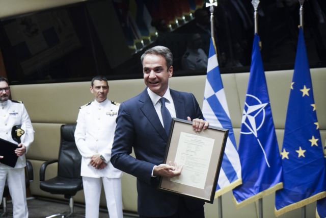 Ο κ. Μητσοτάκης έλαβε μια τιμητική πλακέτα από τον υπουργό Εθνικής Άμυνας, Νίκο Παναγιωτόπουλο με το θυρεό του Γενικού Επιτελείου Εθνικής Άμυνας και μια κορνίζα με το Πιστοποιητικό Στρατολογικής Κατάταξης, όπου αναφέρονται οι βάσεις και οι θέσεις που υπηρέτησε ως σμηνίτης.