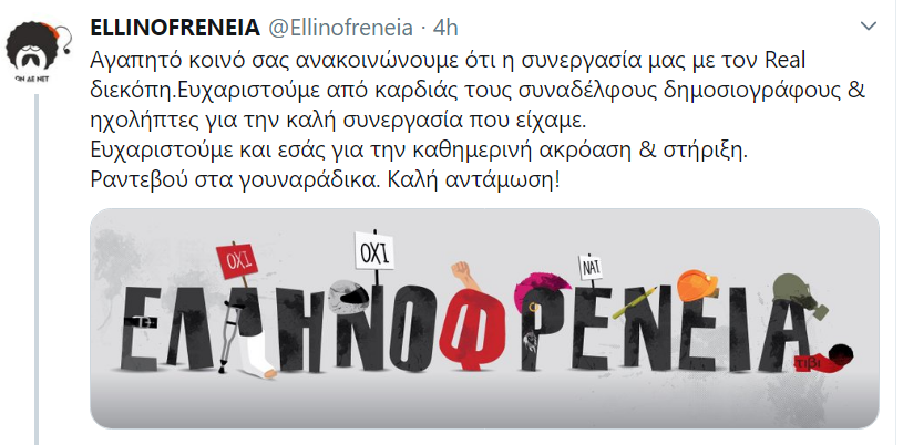 «Αγαπητό κοινό σας ανακοινώνουμε ότι η συνεργασία μας με τον Real διεκόπη.Ευχαριστούμε από καρδιάς τους συναδέλφους δημοσιογράφους & ηχολήπτες για την καλή συνεργασία που είχαμε. Ευχαριστούμε και εσάς για την καθημερινή ακρόαση & στήριξη. Ραντεβού στα γουναράδικα. Καλή αντάμωση!».
