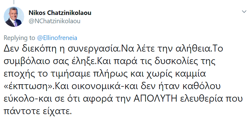 Το ποστ αυτό προκάλεσε την αντίδραση του Ν. Χατζηνικολάου, ο οποίος απάντησε:
