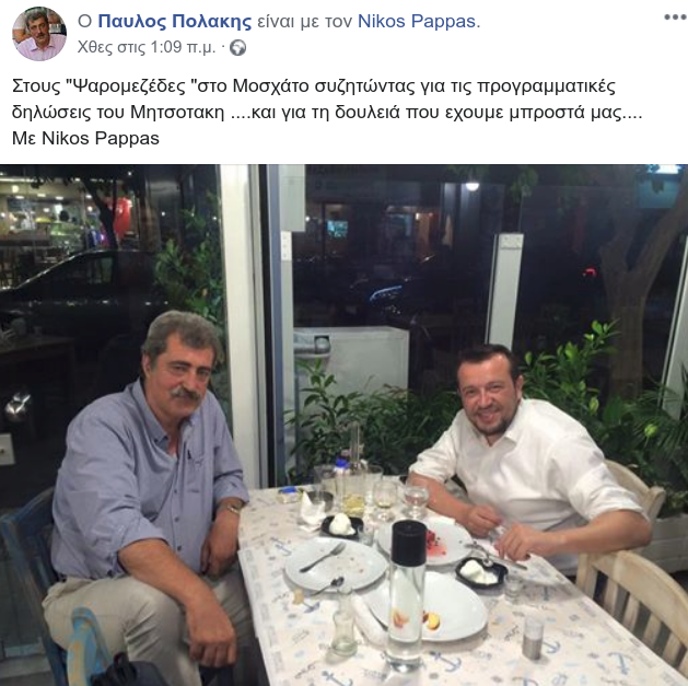 Οι δύο πρώην υπουργοί του ΣΥΡΙΖΑ, οι οποίοι αυτή τη στιγμή δεν συμμετέχουν ούτε στο κομματικό οργανόγραμμα ώστε να έχουν επιβαρυμένο πρόγραμμα, συνέφαγαν την Κυριακή σε ψαροταβέρνα στο Μοσχάτο, όπως γνωστοποίησε ο Παύλος Πολάκης στο λογαριασμό του στο Facebook.