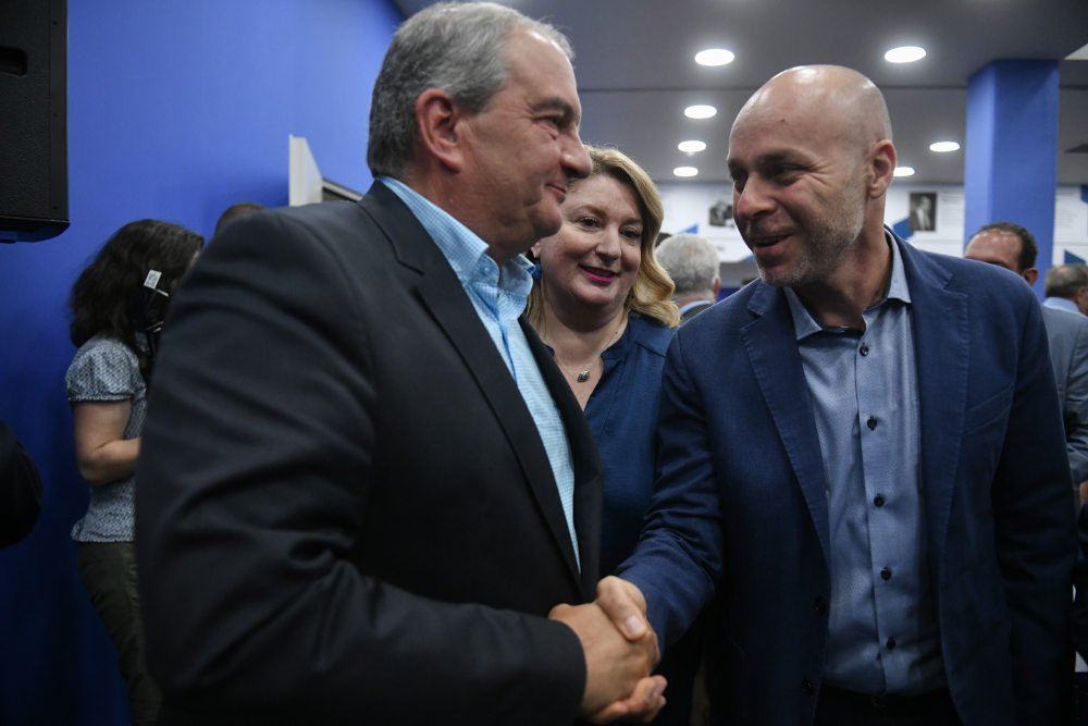 Ιδιαίτερα θερμή όμως ήταν η χειραψία του Κώστα Καραμανλή και με τον πρωθυπουργό Κυριάκο Μητσοτάκη.