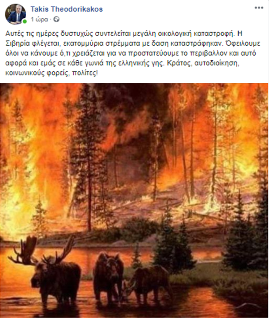 «Αυτές τις ημέρες δυστυχώς συντελείται μεγάλη οικολογική καταστροφή. Η Σιβηρία φλέγεται, εκατομμύρια στρέμματα με δαση καταστράφηκαν» αναφέρει χαρακτηριστικά στην ανάρτησή του ο Τάκης Θεοδωρικάκος και στέκεται στις ευθύνες όλων: