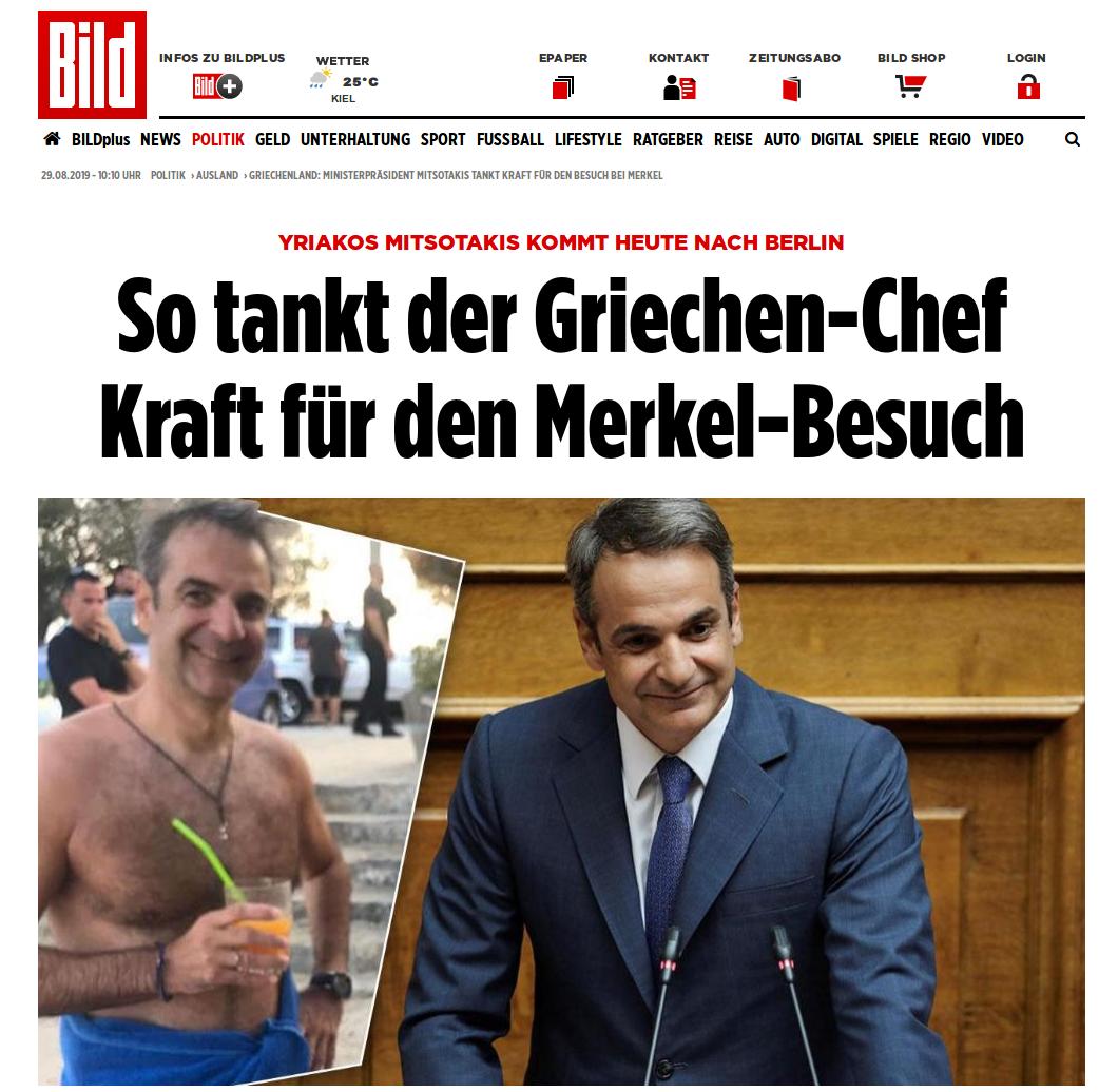 Σχολιάζοντας ότι με αυτόν τον τρόπο αντλεί δύναμη για τη συνάντησή του με την Ανγκελα Μέρκελ, η γερμανική Bild ποστάρει φωτογραφία του Κυριάκου Μητσοτάκη με μαγιό.