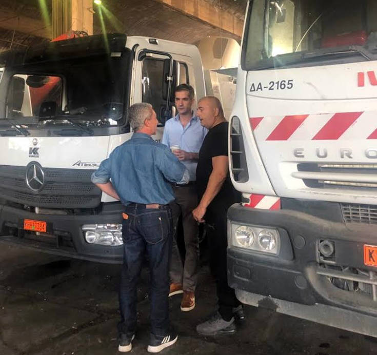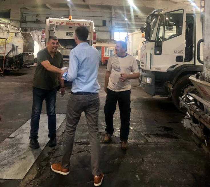 Ήταν η πρώτη του ημέρα στον δήμο μετά τις χθεσινές αρχαιρεσίες για το Δημοτικό Συμβούλιο και ο Κώστας Μπακογιάννης επέλεξε να την ξεκινήσει από τη διεύθυνση Καθαριότητας του Δήμου Αθηναίων στο αμαξοστάσιο της Ιεράς οδού.
