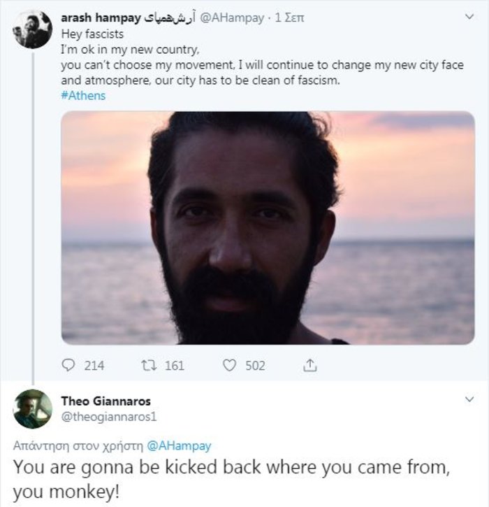 Το περιστατικό ξεκίνησε όταν σε ανάρτησή του, ο Arash Hampay «πρόσφυγας» από το Ιράν που ήρθε παράνομα στην Ελλάδα έγραψε στα αγγλικά άγνωστο εάν απευθυνόταν σε κάποιους ειδικά.