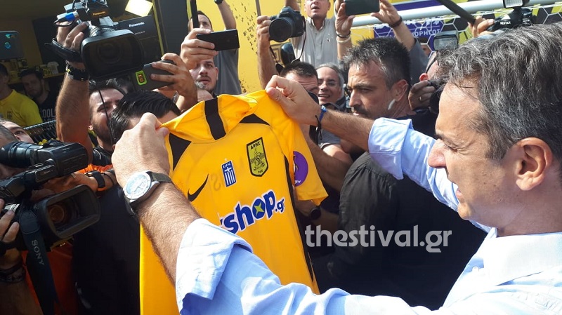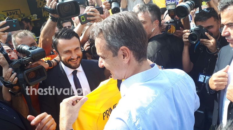 Ακόμα μία φανέλα δέχτηκε ο Πρωθυπουργός την ώρα που πέρασε από το περίπτερο του Άρη, ενώ παράλληλα συναντήθηκε με τον Θεόδωρο Καρυπίδη. Σε αυτή τη φανέλα αναγράφεται το Primer Mister και έχει τον αριθμό 1.