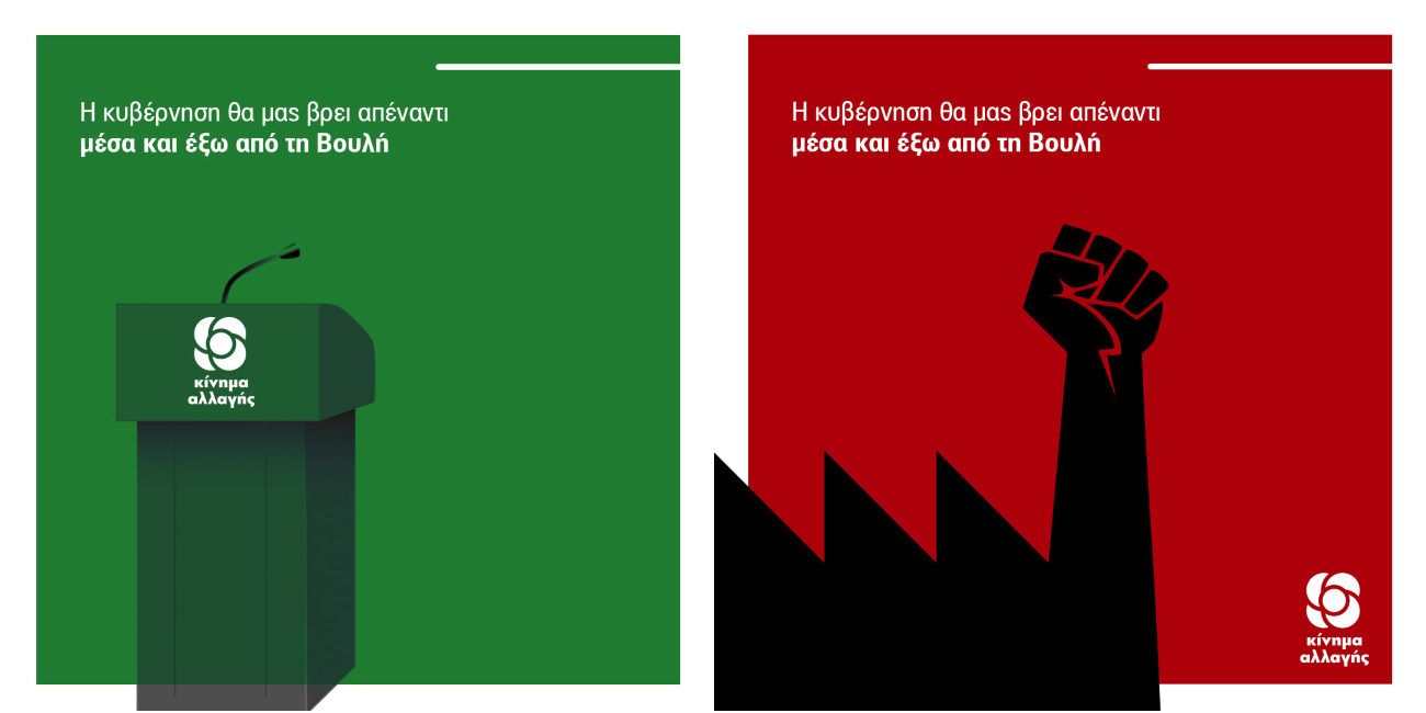 Το ΚΙΝΑΛ σε μία προσπάθεια να πει όχι στις αλλαγές που σχεδιάζει η κυβέρνηση στις συλλογικές συμβάσεις έβγαλε μία αφίσα σε κόκκινο φόντο που απεικόνιζε ένα εργοστάσιο μαύρου χρώματος, με τις στέγες του να είναι μυτερές και στη δεξιά πλευρά η καμινάδα του καταλήγει σε ένα ανθρώπινο χέρι, σφιγμένο σε γροθιά. Την αφίσα συνόδευε η φράση «Η Κυβέρνηση θα μας βρει απέναντι μέσα και έξω από την Βουλή!».
