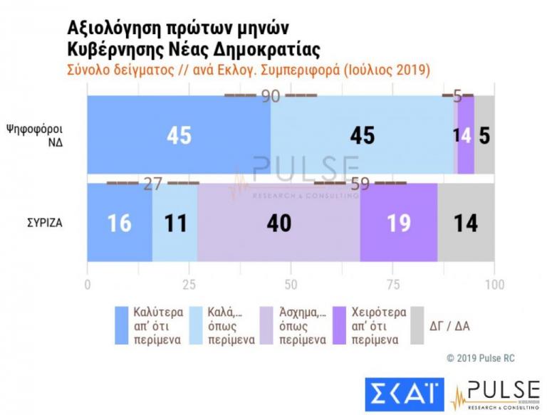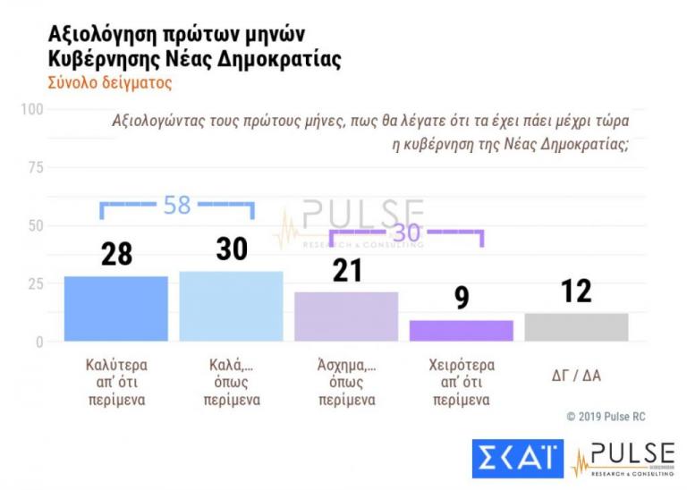 Στο ερώτημα για το πώς αξιολογούνται οι πρώτοι μήνες της κυβέρνησης ΝΔ, έξι στους 10 (58%) λένε ότι πάει καλύτερα ή καλά απ’ ότι περίμενε).