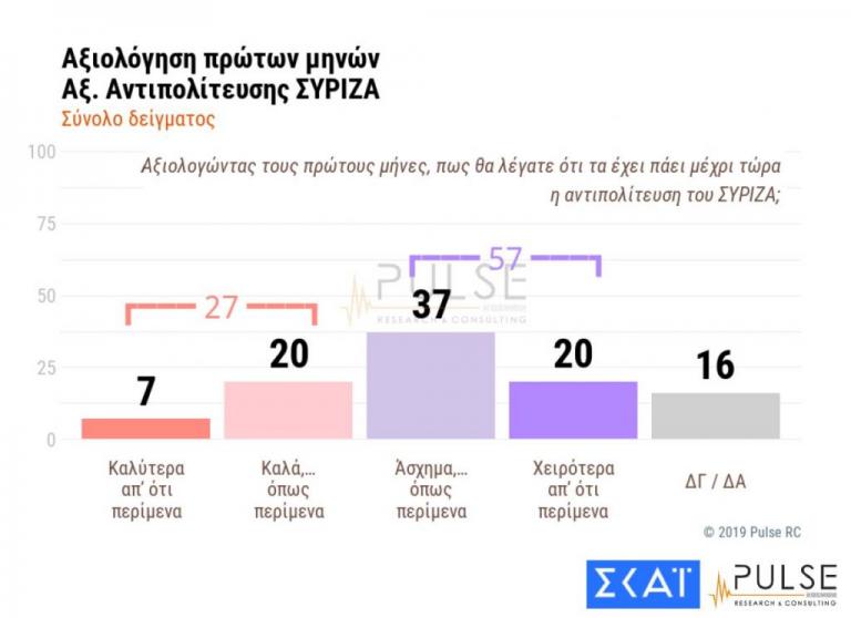 Στην αξιολόγηση του ΣΥΡΙΖΑ ως αξιωματική αντιπολίτευσης, το 57%, δηλαδή σχεδόν 6 στους 10 κρίνουν αρνητικά και μόλις 27% θετικά.